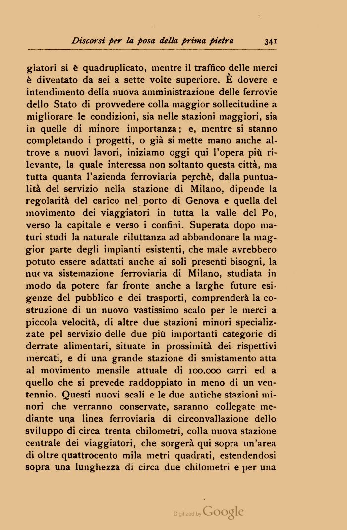 giatori si è quadruplicato, mentre il traffico delle merci è diventato da sei a sette volte superiore. E dovere e intendimento della nuova amministrazione delle ferrovie dello Stato di provvedere colla maggior sollecitudine a migliorare le condizioni, sia nelle stazioni maggiori, sia in quelle di minore importanza; e, mentre si stanno completando i progetti, o già si mette mano anche altrove a nuovi lavori, iniziamo oggi qui l'opera più rilevante, la quale interessa non soltanto questa città, ma tutta quanta l'azienda ferroviaria perchè, dalla puntualità del servizio nella stazione di Milano, dipende la regolarità del carico nel porto di Genova e quella del movimento dei viaggiatori in tutta la valle del Po, verso la capitale e verso i confini. Superata dopo maturi studi la naturale riluttanza ad abbandonare la maggior parte degli impianti esistenti, che male avrebbero potuto essere adattati anche ai soli presenti bisogni, la nucva sistemazione ferroviaria di Milano, studiata in modo da potere far fronte anche a larghe future esigenze del pubblico e dei trasporti, comprenderà la costruzione di un nuovo vastissimo scalo per le merci a piccola velocità, di altre due stazioni minori specializzate pel servizio delle due più importanti categorie di derrate alimentari, situate in prossimità dei rispettivi mercati, e di una grande stazione di smistamento atta al movimento mensile attuale di 100.000 carri ed a quello che si prevede raddoppiato in meno di un ventennio. Questi nuovi scali e le due antiche stazioni minori che verranno conservate, saranno collegate mediante una linea ferroviaria di circonvallazione dello sviluppo di circa trenta chilometri, colla nuova stazione centrale dei viaggiatori, che sorgerà qui sopra un'area di oltre quattrocento mila metri quadrati, estendendosi sopra una lunghezza di circa due chilometri e per una