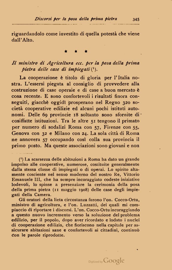 Gii oratori della lieta circostanza furono l'on. Cocco-Ortu, ministro di agricoltura, e l'on. Luzzatti, dei quali mi compiaccio di riportare i discorsi. L'on. Cocco-Ortu incoraggiando a questo nuovo incremento verso la soluzione del problema edilizio, per il popolo, dopo aver ricordato e lodato i nuclei di cooperazione edilizia, che fioriscono nella capitale per assicurare abitazioni sane e confortevoli ai cittadini, continuò Con le parole riprodotte.