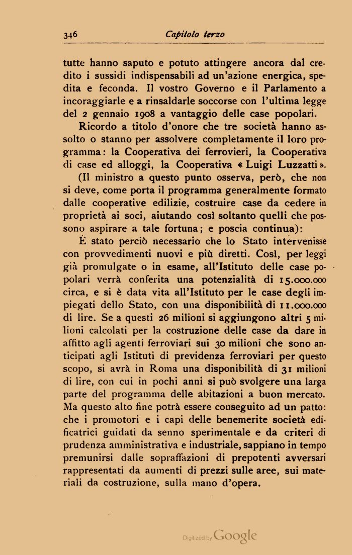 Ricordo a titolo d'onore che tre società hanno assolto o stanno per assolvere completamente il loro programma : la Cooperativa dei ferrovieri, la Cooperativa di case ed alloggi, la Cooperativa «Luigi Luzzatti».