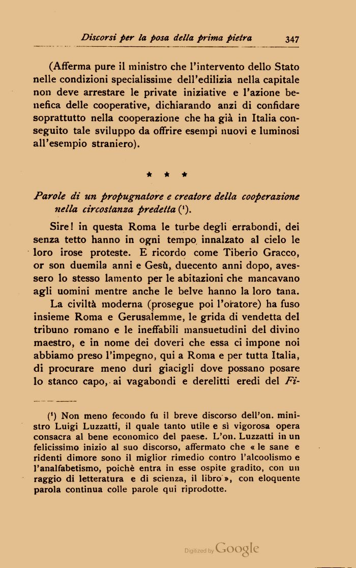 (Afferma pure il ministro che l'intervento dello Stato nelle condizioni specialissime dell'edilizia nella capitale non deve arrestare le private iniziative e l'azione benefica delle cooperative, dichiarando anzi di confidare soprattutto nella cooperazione che ha già in Italia conseguito tale sviluppo da offrire esempi nuovi e luminosi all'esempio straniero).