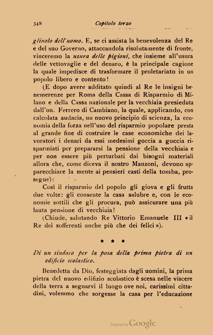 (E dopo avere additato quindi al Re le insigni benemerenze per Roma della Cassa di Risparmio di Milano e della Cassa nazionale per la vecchiaia presieduta dall'on. Ferrerò di Cambiano, la quale, applicando, con calcolata audacia, un nuovo principio di scienza, la economia della forza nell'uso del risparmio popolare presta al grande fine di costruire le case economiche dei lavoratori i denari da essi medesimi goccia a goccia risparmiati per prepararsi la pensione della vecchiaia e per non essere più perturbati dai bisogni materiali allora che, come diceva il nostro Manzoni, devono apparecchiare la mente ai pensieri casti della tomba, prosegue):