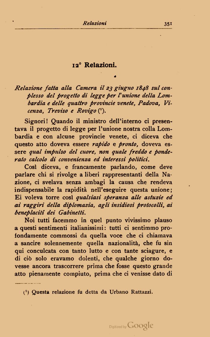 Relazione fatta alla Camera il 23 giugno 184.8 sul conplesso del progetto di legge per Vunione della Lombardia e delle quattro Provincie venete, Padova, Vicenza, Treviso e Rovigo (').
