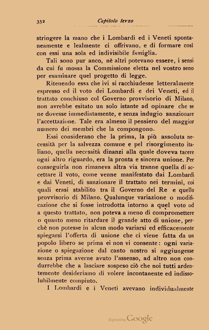 Ritenendo essa che ivi si racchiudesse letteralmente espresso ed il voto dei Lombardi e dei Veneti, ed il trattato conchiuso col Governo provvisorio di Milano, non avrebbe esitato un solo istante ad opinare che se ne dovesse immediatamente, e senza indugio sanzionare l'accettazione. Tale era almeno il pensiero del maggior numero dei membri che la compongono.