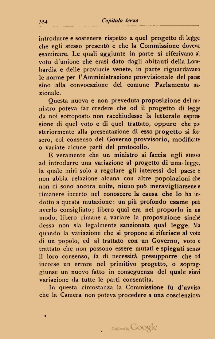 E veramente che un ministro si faccia egli stesso ad introdurre una variazione al progetto di una legge, la quale miri solo a regolare gli interessi del paese e non abbia relazione alcuna con altre popolazioni che non ci sono ancora unite, niuno può meravigliarsene e rimanere incerto nel conoscere la causa che lo ha indotto a questa mutazione : un più profondo esame può averlo consigliato; libero qual era nel proporlo in un modo, libero rimane a variare la proposizione sinché dessa non sia legalmente sanzionata qual legge. Ma quando la variazione che si propone si riferisce al voto di un popolo, ed al trattato con un Governo, voto e trattato che non possono essere mutati e spiegati senza il loro consenso, fa di necessità presupporre che od incorse un errore nel primitivo progetto, o sopraggiunse un nuovo fatto in conseguenza del quale siavi variazione da tutte le parti consentita.