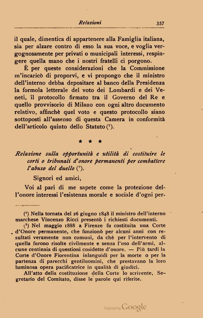 Relazione sulla opportunità, e utilità di costituire le corti o tribunali d'onore permanenti per combattere l'abuso del ditello ()•