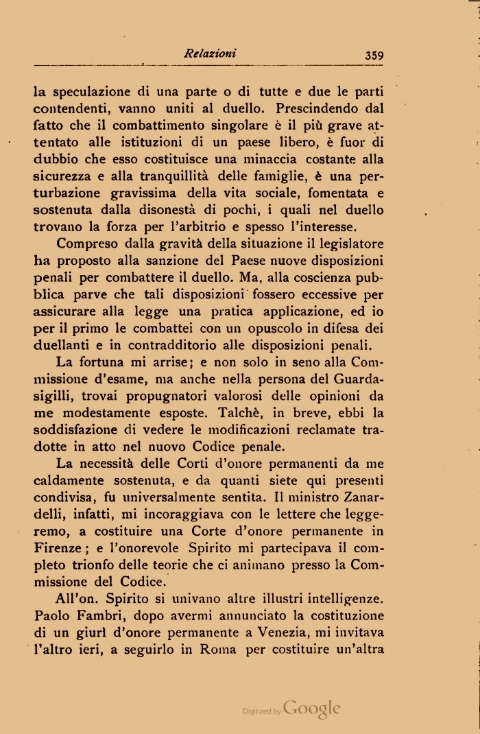 La necessità delle Corti d'onore permanenti da me caldamente sostenuta, e da quanti siete qui presenti condivisa, fu universalmente sentita. Il ministro Zanar-delli, infatti, mi incoraggiava con le lettere che leggeremo, a costituire una Corte d'onore permanente in Firenze ; e l'onorevole Spirito mi partecipava il completo trionfo delle teorie che ci animano presso la Commissione del Codice.