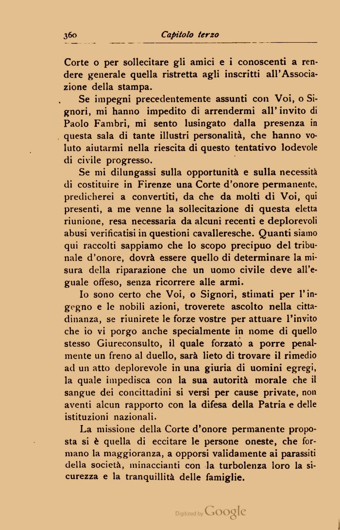 Se mi dilungassi sulla opportunità e sulla necessità di costituire in Firenze una Corte d'onore permanente, predicherei a convertiti, da che da molti di Voi, qui presenti, a me venne la sollecitazione di questa eletta riunione, resa necessaria da alcuni recenti e deplorevoli abusi verificatisi in questioni cavalleresche. Quanti siamo qui raccolti sappiamo che lo scopo precipuo del tribunale d'onore, dovrà essere quello di determinare la misura della riparazione che un uomo civile deve all'eguale offeso, senza ricorrere alle armi.