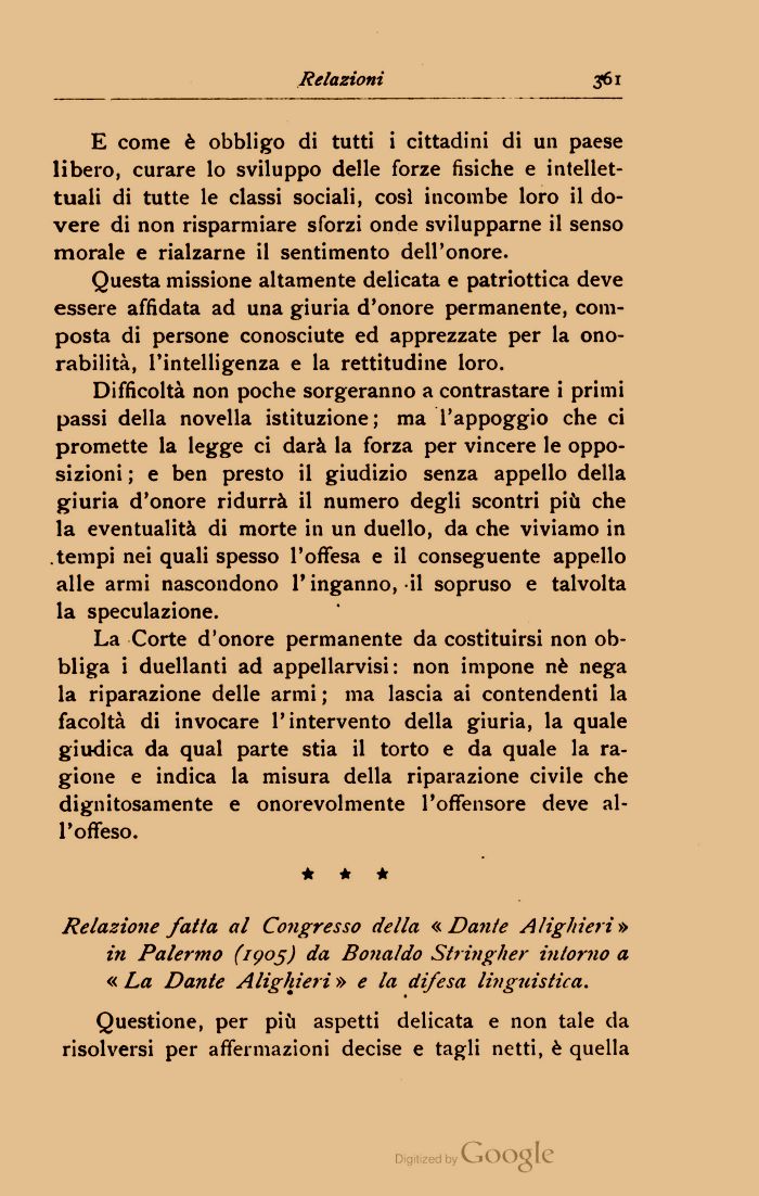 Relazione fatta al Congresso della « Dante Alighieri » in Palermo (1905) da Bonaldo Stringher intorno a « La Dante Alighieri » e la difesa linguistica.
