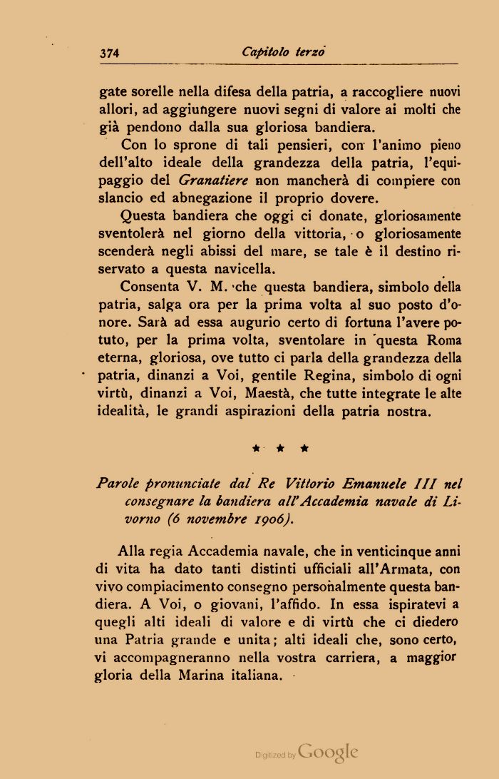 Parole pronunciate dal Re Vittorio Emanuele III nel consegnare la bandiera all' Accademia navale di Livorno (6 novembre 1906).