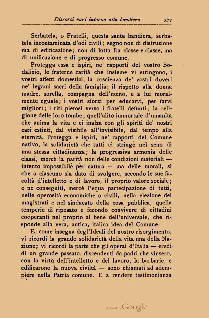 Protegga essa e ispiri, ne' rapporti del vostro Sodalizio, le fraterne carità che insieme vi stringono, i vostri affetti domestici, la coscienza de' vostri doveri ne' legami sacri della famiglia; il rispetto alla donna madre, sorella, compagna dell'uomo, e a lui moralmente eguale ; i vostri sforzi per educarvi, per farvi migliori; i riti pietosi Verso i fratelli defunti; la religione delle loro tombe; quell'alito immortale d'umanità che anima la vita e ci inalza con gli spiriti de' nostri cari estinti, dal visibile all'invisibile, dal tempo alla eternità. Protegga e ispiri, ne' rapporti del Comune nativo, la solidarietà che tutti ci stringe nel seno di una stessa cittadinanza ; la progressiva armonia delle classi, mercè la parità non delle condizioni materiali — intento impossibile per natura — ma delle morali, si che a ciascuno sia dato di svolgere, secondo le sue facoltà d'intelletto e di lavoro, il proprio valore sociale ; e ne conseguiti, mercè l'equa partecipazione di tutti, nelle operosità economiche o civili, nella elezione dei magistrati e nel sindacato della cosa pubblica, quella temperie di riposato e fecondo convivere di cittadini cooperanti nel proprio al bene dell'universale, che risponde alla vera, antica, italica idea del Comune.