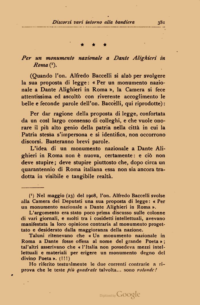 L'idea di un monumento nazionale a Dante Alighieri in Roma non è nuova, certamente : e ciò non deve stupire; deve stupire piuttosto che, dopo circa un quarantennio di Roma italiana essa non sia ancora tradotta in visibile e tangibile realtà.