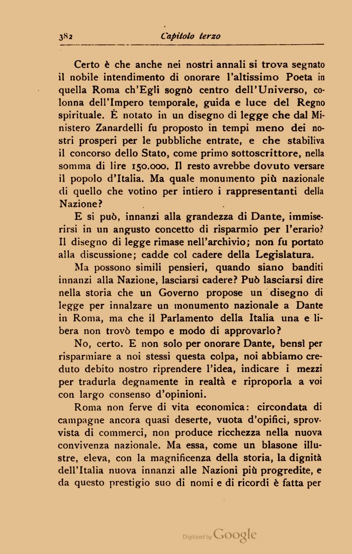 Ma possono simili pensieri, quando siano banditi innanzi alla Nazione, lasciarsi cadere? Può lasciarsi dire nella storia che un Governo propose un disegno di legge per innalzare un monumento nazionale a Dante in Roma, ma che il Parlamento della Italia una e libera non trovò tempo e modo di approvarlo?