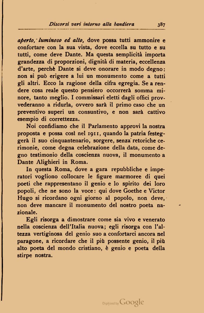Noi confidiamo che il Parlamento approvi la nostra proposta e possa cosi nel 1911, quando la patria festeggerà il suo cinquantenario, sorgere, senza'retoriche cerimonie, come degna celebrazione della data, come degno testimonio della coscienza nuova, il monumento a Dante Alighieri in Roma.