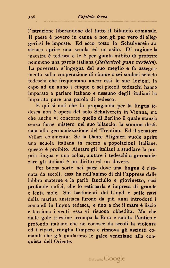 E qui si noti che la propaganda per la lingua tedesca non è opera del solo Schulverein in Vienna, ma che anche vi concorre quello di Berlino il quale stanzia senza farne mistero nel suo bilancio, la somma destinata alla germanizzazione del Trentino. Ed il senatore Villari commenta: Se la Dante Alighieri vuole aprire una scuola italiana in mezzo a popolazioni italiane, questo è proibito. Aiutare gli italiani a studiare la propria lingua è una colpa, aiutare i tedeschi a germanizzare gli italiani è un diritto ed un dovere.