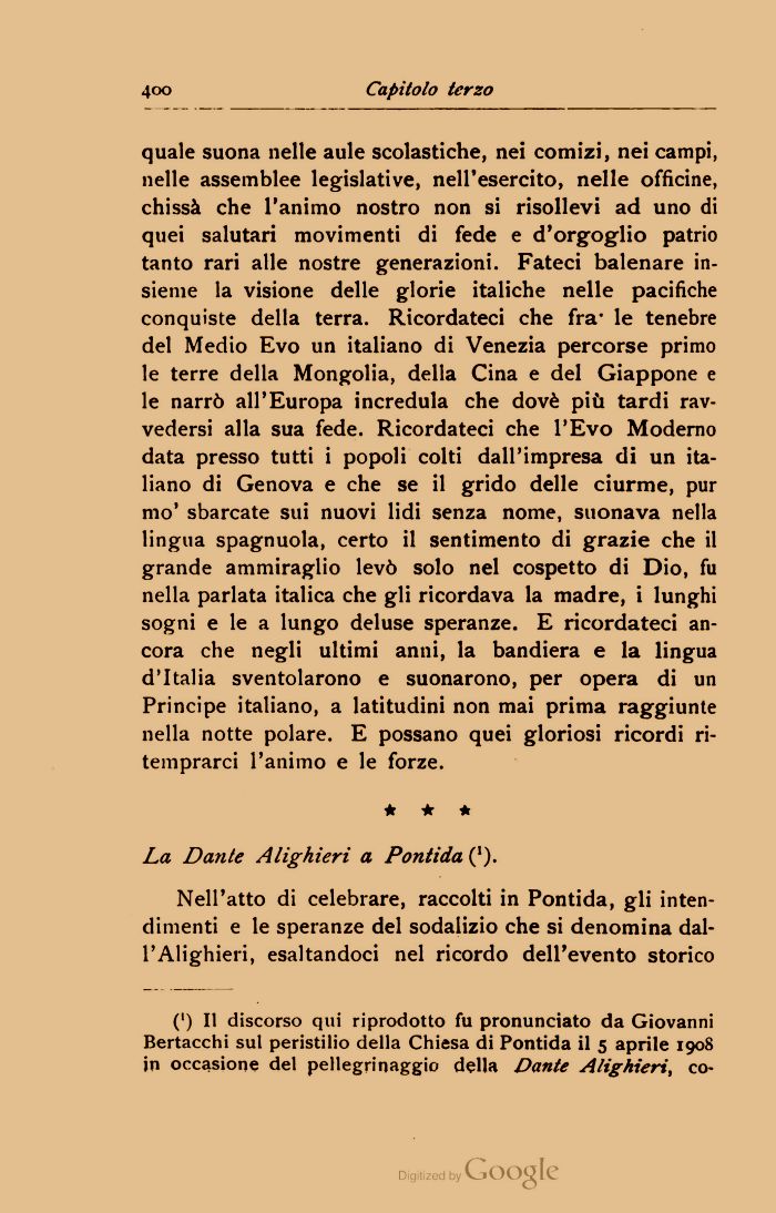(') Il discorso qui riprodotto fu pronunciato da Giovanni Bertacchi sul peristilio della Chiesa di Pontida il 5 aprile 1908 in occasione del pellegrinaggio della Dante Alighieri, co-