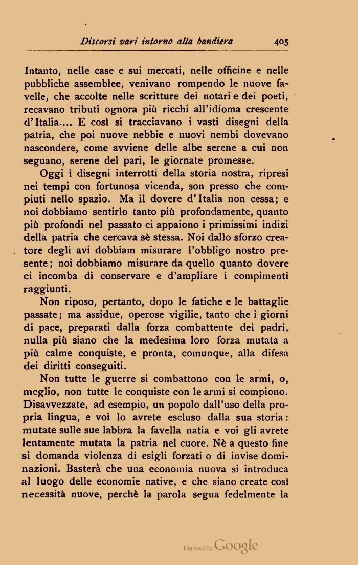 Intanto, nelle case e sui mercati, nelle officine e nelle pubbliche assemblee, venivano rompendo le nuove favelle, che accolte nelle scritture dei notari e dei poeti, recavano tributi ognora pił ricchi all'idioma crescente d'Italia.... E cosi si tracciavano i vasti disegni della patria, che poi nuove nebbie e nuovi nembi dovevano nascondere, come avviene delle albe serene a cui non seguano, serene del pari, le giornate promesse.
