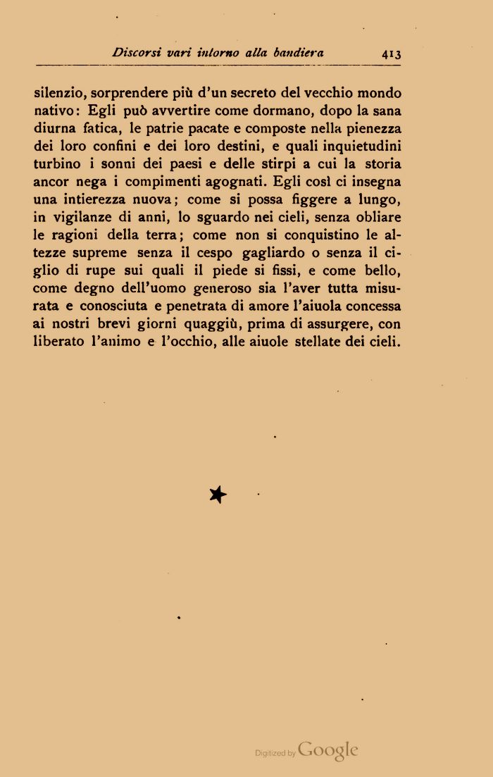 silenzio, sorprendere più d'un secreto del vecchio mondo nativo : Egli può avvertire come dormano, dopo la sana diurna fatica, le patrie pacate e composte nella pienezza dei loro confini e dei loro destini, e quali inquietudini turbino i sonni dei paesi e delle stirpi a cui la storia ancor nega i compimenti agognati. Egli cosi ci insegna una intierezza nuova ; come si possa figgere a lungo, in vigilanze di anni, lo sguardo nei cieli, senza obliare le ragioni della terra; come non si conquistino le altezze supreme senza il cespo gagliardo o senza il ciglio di rupe sui quali il piede si fissi, e come bello, come degno dell'uomo generoso sia l'aver tutta misurata e conosciuta e penetrata di amore l'aiuola concessa ai nostri brevi giorni quaggiù, prima di assurgere, con liberato l'animo e l'occhio, alle aiuole stellate dei cieli.