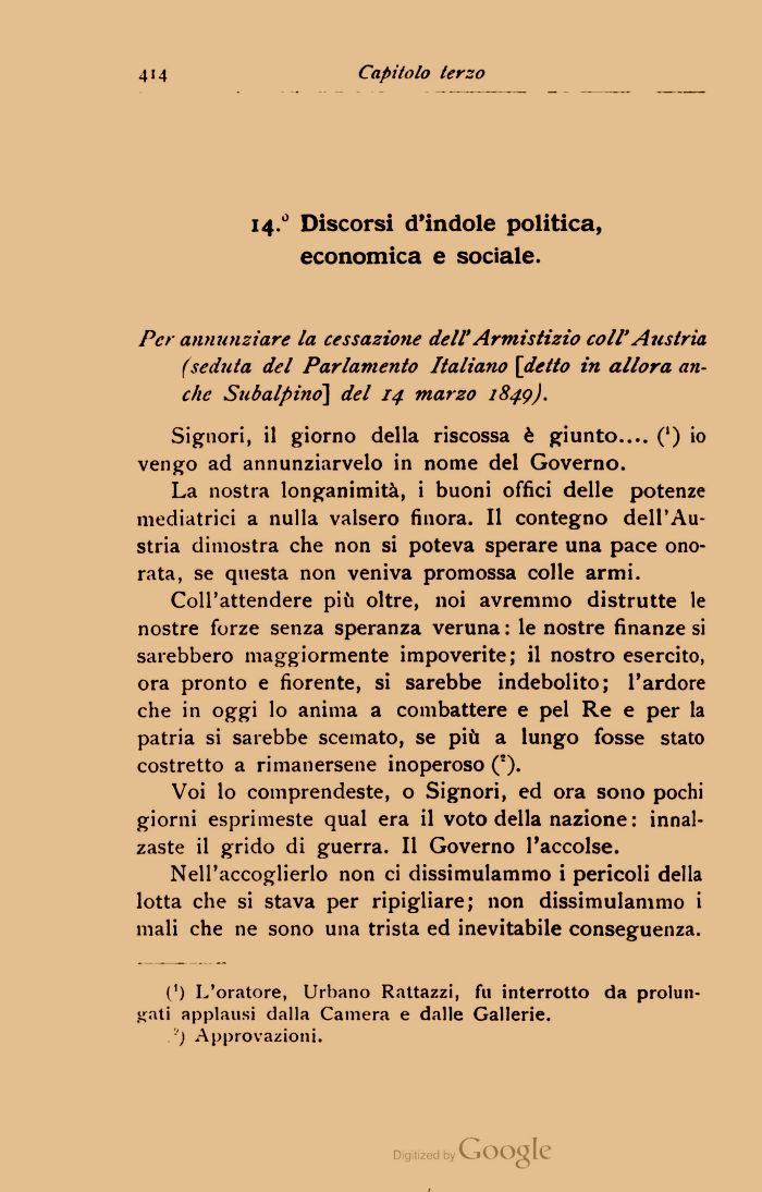 Per annunziare la cessazione dell' Armistizio coli' Austria (seduta del Parlamento Italiano [detto in allora anche Subalpino] del 14 marzo 1849).