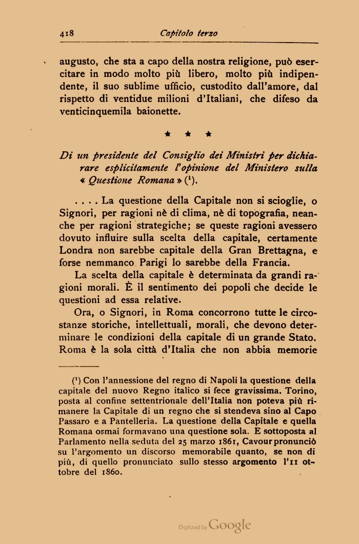 (') Con l'annessione del regno di Napoli la questione della capitale del nuovo Regno italico si fece gravissima. Torino, posta al confine settentrionale dell'Italia non poteva più rimanere la Capitale di un regno che si stendeva sino al Capo Passaro e a Pantelleria. La questione della Capitale e quella Romana ormai formavano una questione sola. E sottoposta al Parlamento nella seduta del 25 marzo 1861, Cavour pronunciò su l'argomento un discorso memorabile quanto, se non di più, di quello pronunciato sullo stesso argomento l'u ottobre del 1860.