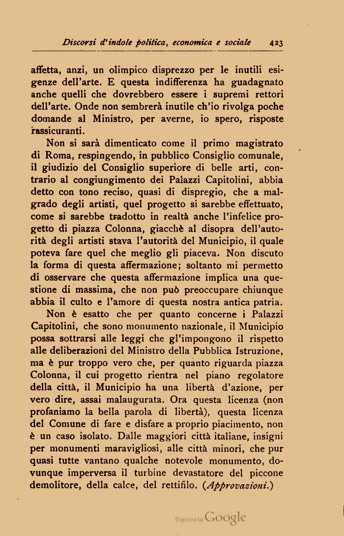 Non si sarà dimenticato come il primo magistrato di Roma, respingendo, in pubblico Consiglio comunale, il giudizio del Consiglio superiore di belle arti, contrario al congiungimento dei Palazzi Capitolini, abbia detto con tono reciso, quasi di dispregio, che a malgrado degli artisti, quel progetto si sarebbe effettuato, come si sarebbe tradotto in realtà anche l'infelice progetto di piazza Colonna, giacché al disopra dell'autorità degli artisti stava l'autorità del Municipio, il quale poteva fare quel che meglio gli piaceva. Non discuto la forma di questa affermazione; soltanto mi permetto di osservare che questa affermazione implica una questione di massima, che non può preoccupare chiunque abbia il culto e l'amore di questa nostra antica patria.