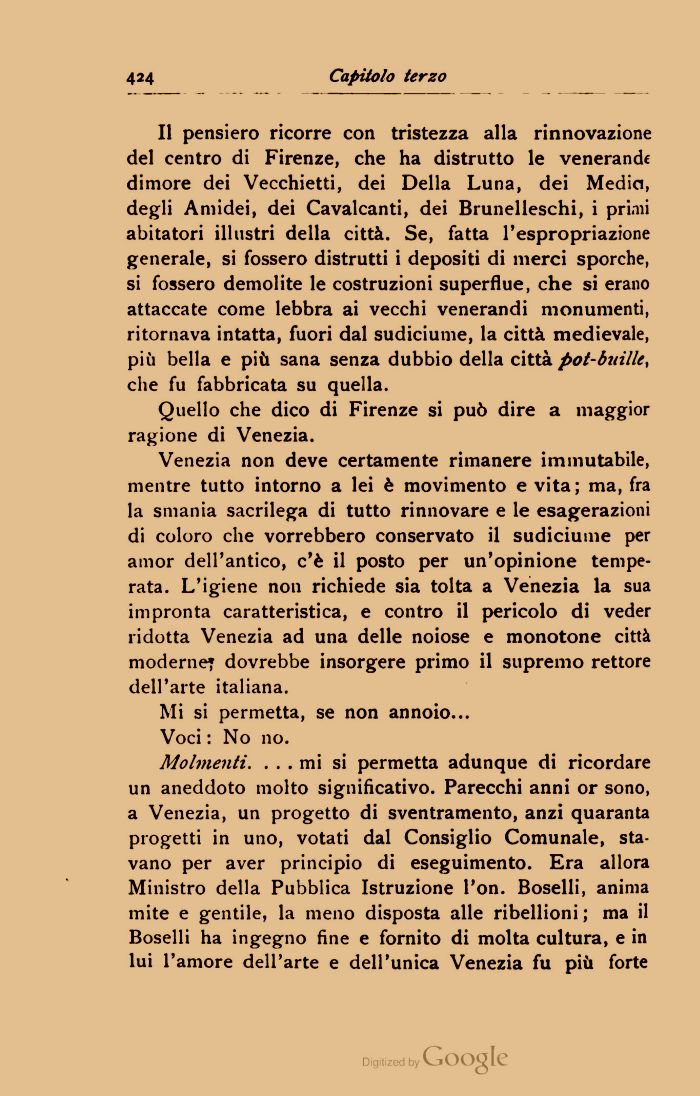 Molmenti. ... mi si permetta adunque di ricordare un aneddoto molto significativo. Parecchi anni or sono, a Venezia, un progetto di sventramento, anzi quaranta progetti in uno, votati dal Consiglio Comunale, stavano per aver principio di eseguimento. Era allora Ministro della Pubblica Istruzione l'on. Boselli, anima mite e gentile, la meno disposta alle ribellioni ; ma il Boselli ha ingegno fine e fornito di molta cultura, e in lui l'amore dell'arte e dell'unica Venezia fu più forte