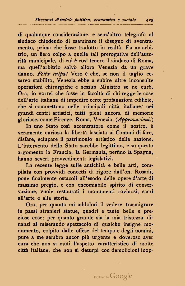 di qualunque considerazione, e senz'altro telegrafò al sindaco chiedendo di esaminare il disegno di sventramento, prima che fosse tradotto in realtà. Fu un arbitrio, un fiero colpo a quelle tali prerogative dell'autorità municipale, di cui è cosi tenero il sindaco di Roma, ma quell'arbitrio salvò allora Venezia da un grave danno. Felix culpa! Vero è che, se non il taglio cesareo stabilito, Venezia ebbe a subire altre inconsulte operazioni chirurgiche e nessun Ministro se ne curò. Ora, io vorrei che fosse in facoltà di chi regge le cose dell'arte italiana di impedire certe profanazioni edilizie, che si commettono nelle principali città italiane, nei grandi centri artistici, tutti pieni ancora di memorie gloriose, come Firenze, Roma, Venezia. (Approvazioni.)