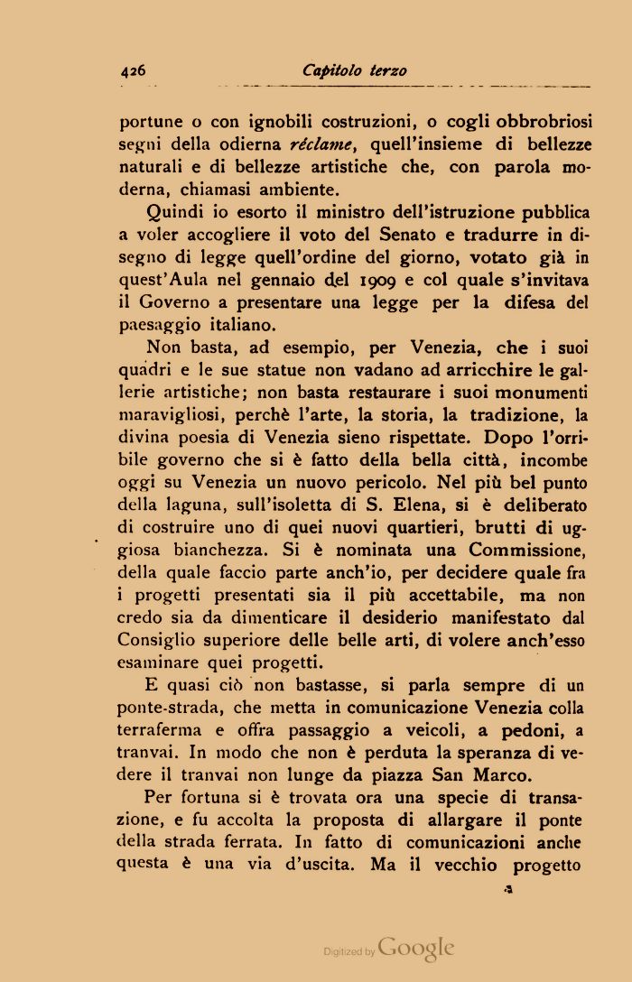 Non basta, ad esempio, per Venezia, che i suoi quadri e le sue statue non vadano ad arricchire le gallerie artistiche; non basta restaurare i suoi monumenti maravigliosi, perchè l'arte, la storia, la tradizione, la divina poesia di Venezia sieno rispettate. Dopo l'orribile governo che si è fatto della bella città, incombe oggi su Venezia un nuovo pericolo. Nel più bel punto della laguna, sull'isoletta di S. Elena, si è deliberato di costruire uno di quei nuovi quartieri, brutti di uggiosa bianchezza. Si è nominata una Commissione, della quale faccio parte anch'io, per decidere quale fra i progetti presentati sia il più accettabile, ma non credo sia da dimenticare il desiderio manifestato dal Consiglio superiore delle belle arti, di volere anch'esso esaminare quei progetti.