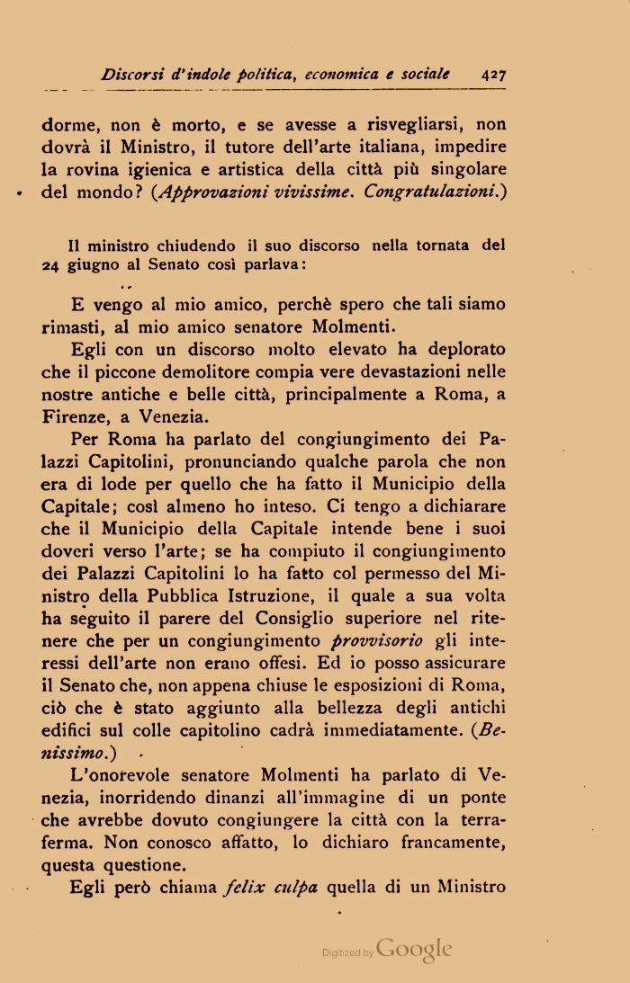 Egli con un discorso molto elevato ha deplorato che il piccone demolitore compia vere devastazioni nelle nostre antiche e belle città, principalmente a Roma, a Firenze, a Venezia.