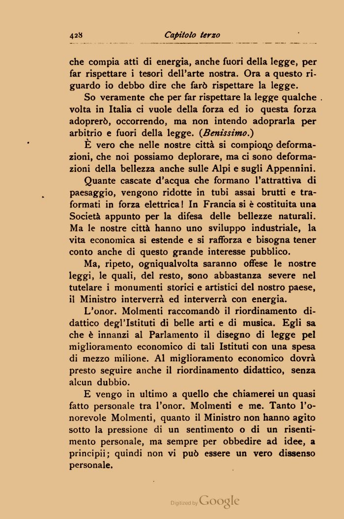 che compia atti di energia, anche fuori della legge, per far rispettare i tesori dell'arte nostra. Ora a questo riguardo io debbo dire che farò rispettare la legge.