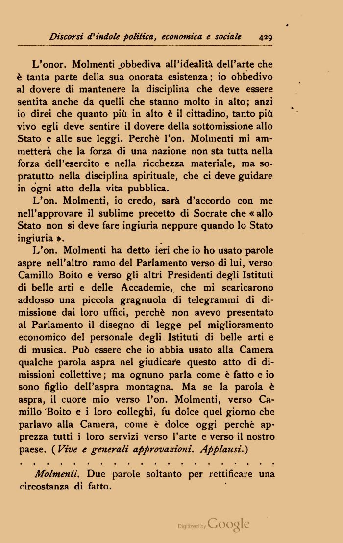 L'on. Molmenti ha detto ieri che io ho usato parole aspre nell'altro ramo del Parlamento verso di lui, verso Camillo Boito e verso gli altri Presidenti degli Istituti di belle arti e delle Accademie, che mi scaricarono addosso una piccola gragnuola di telegrammi di dimissione dai loro uffici, perchè non avevo presentato al Parlamento il disegno di legge pel miglioramento economico del personale degli Istituti di belle arti e di musica. Può essere che io abbia usato alla Camera qualche parola aspra nel giudicare questo atto di dimissioni collettive ; ma ognuno parla come è fatto e io sono figlio dell'aspra montagna. Ma se la parola è aspra, il cuore mio verso l'on. Molmenti, verso Camillo Boito e i loro colleghi, fu dolce quel giorno che parlavo alla Camera, come è dolce oggi perchè apprezza tutti i loro servizi verso l'arte e verso il nostro paese. ( Vive e generali approvazioni. Applausi.)