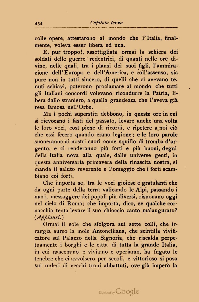 E, pur troppo!, assottigliata ormai la schiera dei soldati delle guerre redentrici, di quanti nelle ore divine, nelle quali, tra i plausi dei suoi figli, l'ammirazione dell'Europa e dell'America, e coll'assenso, sia pure non in tutti sincero, di quelli che ci avevano tenuti schiavi, poterono proclamare al mondo che tutti gli Italiani concordi volevano ricondurre la Patria, libera dallo straniero, a quella grandezza che l'aveva già resa famosa nell'Orbe.