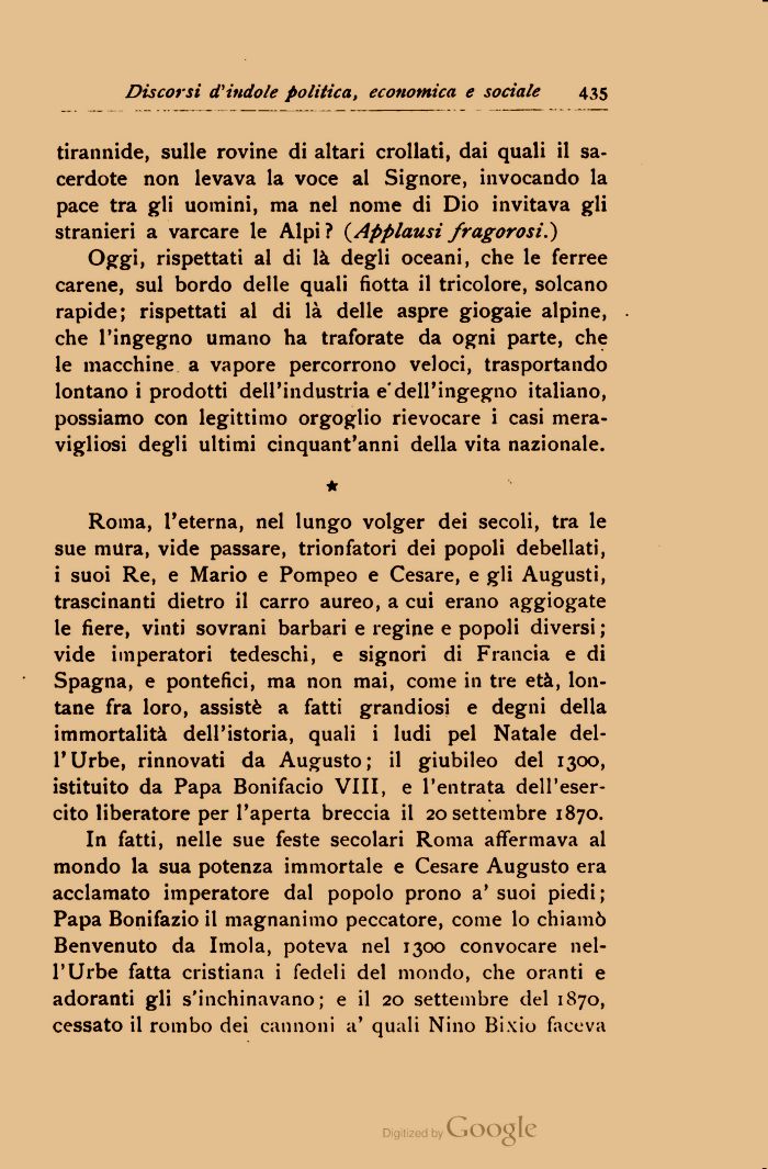 Oggi, rispettati al di là degli oceani, che le ferree carene, sul bordo delle quali fiotta il tricolore, solcano rapide; rispettati al di là delle aspre giogaie alpine, che l'ingegno umano ha traforate da ogni parte, che le macchine a vapore percorrono veloci, trasportando lontano i prodotti dell'industria e'dell'ingegno italiano, possiamo con legittimo orgoglio rievocare i casi meravigliosi degli ultimi cinquant'anni della vita nazionale.
