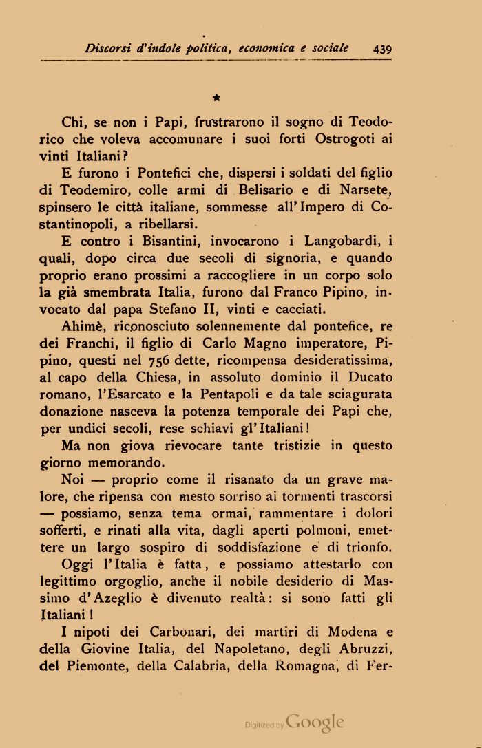 Ahimè, riconosciuto solennemente dal pontefice, re dei Franchi, il figlio di Carlo Magno imperatore, Pipino, questi nel 756 dette, ricompensa desideratissima, al capo della Chiesa, in assoluto dominio il Ducato romano, l'Esarcato e la Pentapoli e da tale sciagurata donazione nasceva la potenza temporale dei Papi che, per undici secoli, rese schiavi gl'Italiani!