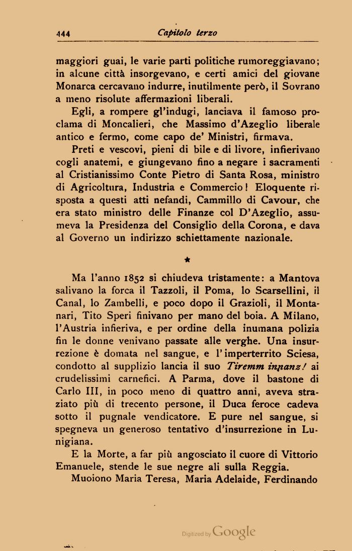 Ma l'anno 1852 si chiudeva tristamente: a Mantova salivano la forca il Tazzoli, il Poma, lo Scarsellini, il Canal, lo Zambelli, e poco dopo il Grazioli, il Montanari, Tito Speri finivano per mano del boia. A Milano, l'Austria infieriva, e per ordine della inumana polizia fin le donne venivano passate alle verghe. Una insurrezione è domata nel sangue, e l'imperterrito Sciesa, condotto al supplizio lancia il suo Tiremm injianz! ai crudelissimi carnefici. A Parma, dove il bastone di Carlo III, in poco meno di quattro anni, aveva straziato più di trecento persone, il Duca feroce cadeva sotto il pugnale vendicatore. E pure nel sangue, si spegneva un generoso tentativo d'insurrezione in Lu-nigiana.
