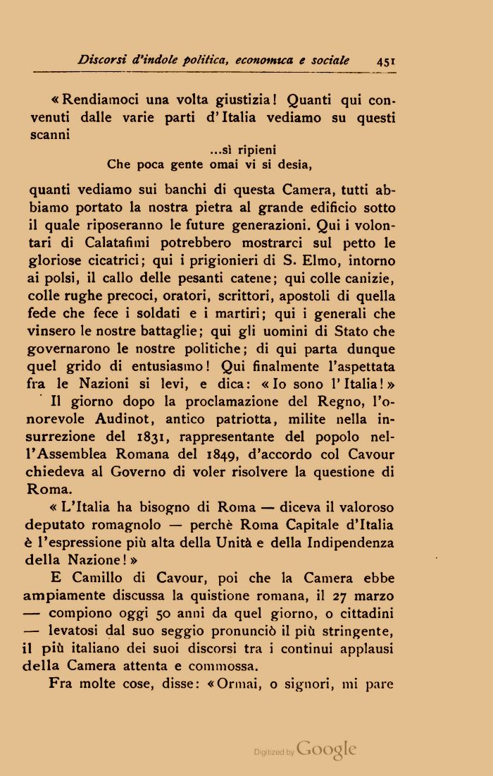 E Camillo di Cavour, poi che la Camera ebbe ampiamente discussa la quistione romana, il 27 marzo