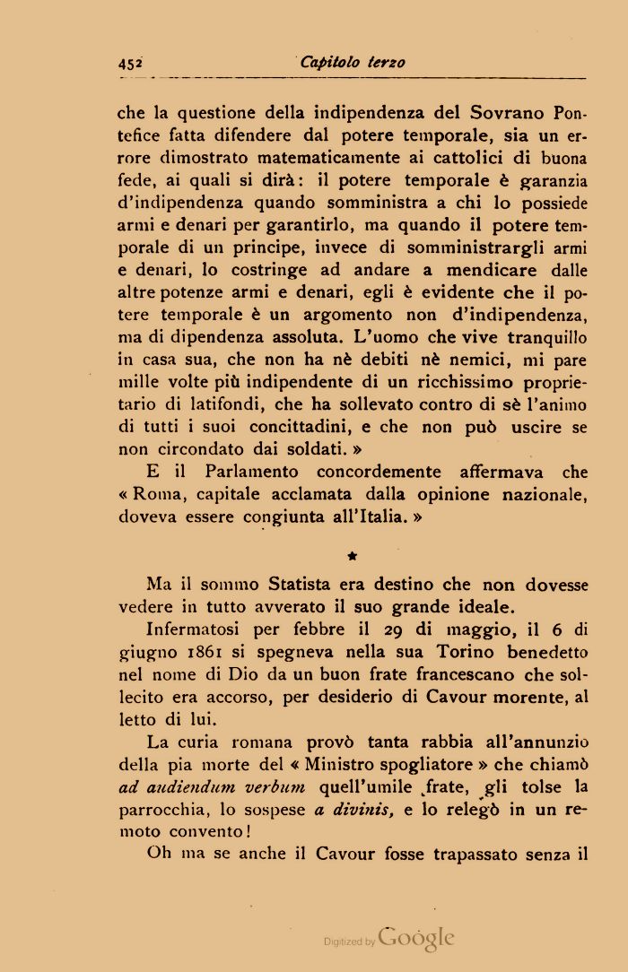 che la questione della indipendenza del Sovrano Pontefice fatta difendere dal potere temporale, sia un errore dimostrato matematicamente ai cattolici di buona fede, ai quali si dirà: il potere temporale è garanzia d'indipendenza quando somministra a chi lo possiede armi e denari per garantirlo, ma quando il potere temporale di un principe, invece di somministrargli armi e denari, lo costringe ad andare a mendicare dalle altre potenze armi e denari, egli è evidente che il potere temporale è un argomento non d'indipendenza, ma di dipendenza assoluta. L'uomo che vive tranquillo in casa sua, che non ha nè debiti nè nemici, mi pare mille volte più indipendente di un ricchissimo proprietario di latifondi, che ha sollevato contro di sè l'animo di tutti i suoi concittadini, e che non può uscire se non circondato dai soldati. »