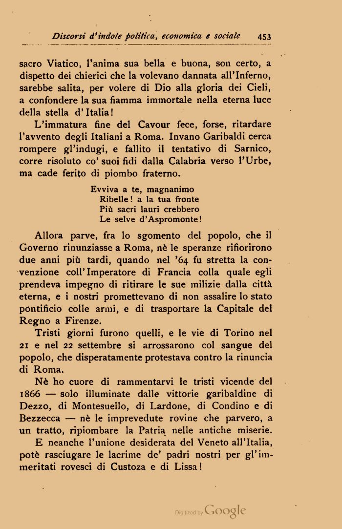 Nè ho cuore di rammentarvi le tristi vicende del 1866 — solo illuminate dalle vittorie garibaldine di Dezzo, di Montesuello, di Lardone, di Condino e di Bezzecca — nè le imprevedute rovine che parvero, a un tratto, ripiombare la Patria nelle antiche miserie.