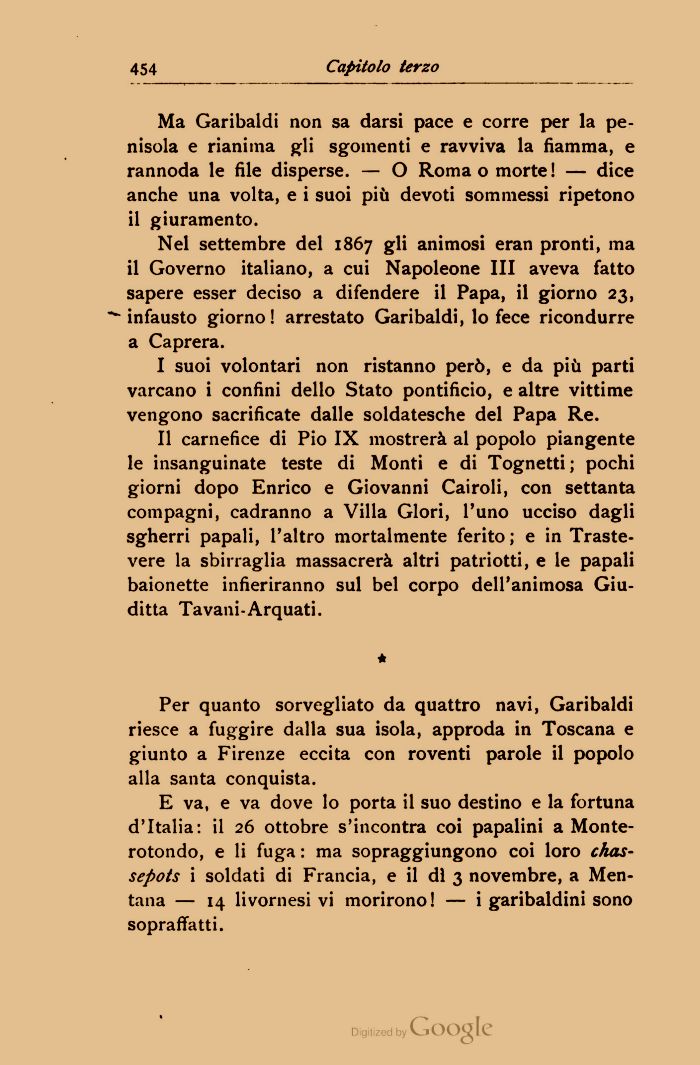 Nel settembre del 1867 gli animosi eran pronti, ma il Governo italiano, a cui Napoleone III aveva fatto sapere esser deciso a difendere il Papa, il giorno 23, infausto giorno! arrestato Garibaldi, lo fece ricondurre a Caprera.