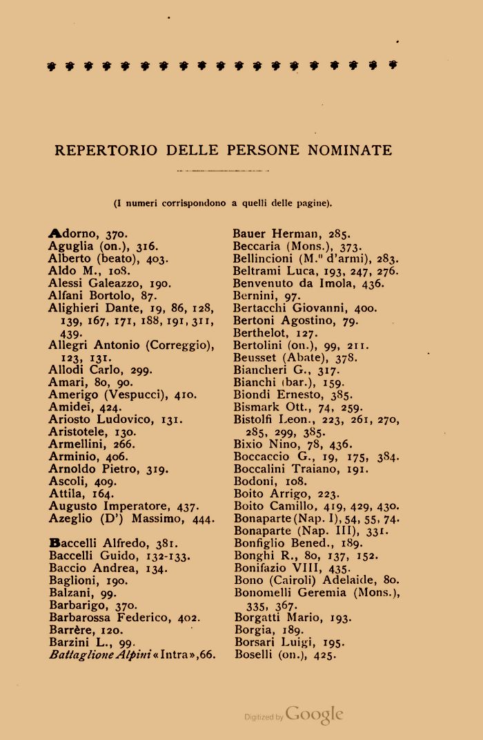 Adorno, 370. Aguglia (on.), 316. Alberto (beato), 403. Aldo M., 10S. Alessi Galeazzo, 190. Alfani Bortolo, 87. Alighieri Dante, 19, 86, 12S, 139, 167, 171, 1S8, 191, 311, 439-