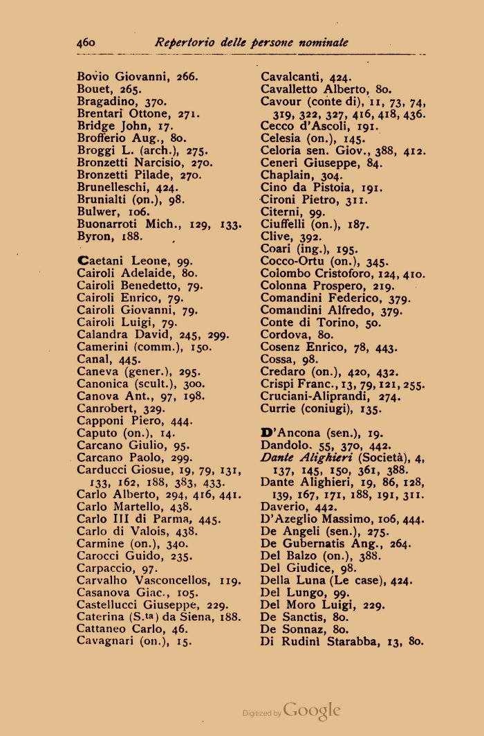 Cavalcanti, 424. Cavalletto Alberto, 80. Cavour (conte di), 11, 73, 74, 319, 322, 327, 416, 418, 436. Cecco d'Ascoli, 191. Celesia (on.), 145. Celoria sen. Giov., 388, 412. Ceneri Giuseppe, 84. Chaplain, 304. Cino da Pistoia, 191. Gironi Pietro, 311. Citerni, 99. Ciuffelli (on.), 187. Clive, 392. Coari (ing.), 195. Cocco-Ortu (on.), 345. Colombo Cristoforo, 124, 410. Colonna Prospero, 219. Comandini Federico, 379. Comandini Alfredo, 379. Conte di Torino, 50. Cordova, 80. Cosenz Enrico, 78, 443. Cossa, 98.
