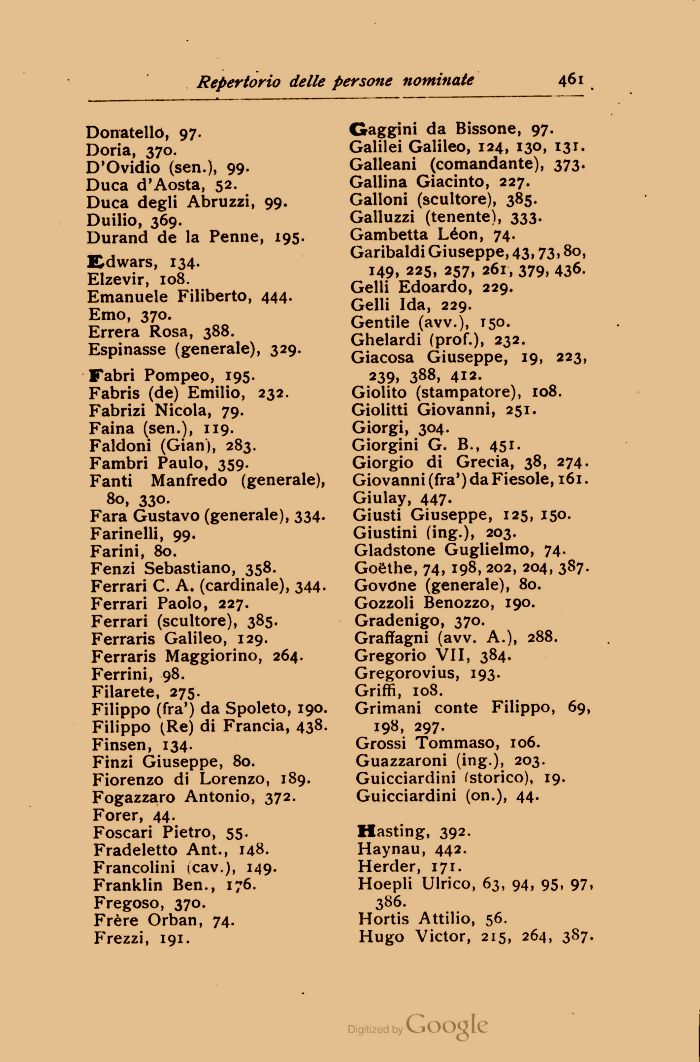 Gaggini da Bissone, 97. Galilei Galileo, 124, 130, t3r. Galleani (comandante), 373. Gallina Giacinto, 227. Galloni (scultore), 385. Galluzzi (tenente), 333. Gambetta Léon, 74. Garibaldi Giuseppe, 43,73,80, 149, 225, 257, 261, 379, 436. Gelli Edoardo, 229. Gelli Ida, 229. Gentile (avv.), 150. Ghelardi (prof.), 232. Giacosa Giuseppe, 19, 223,