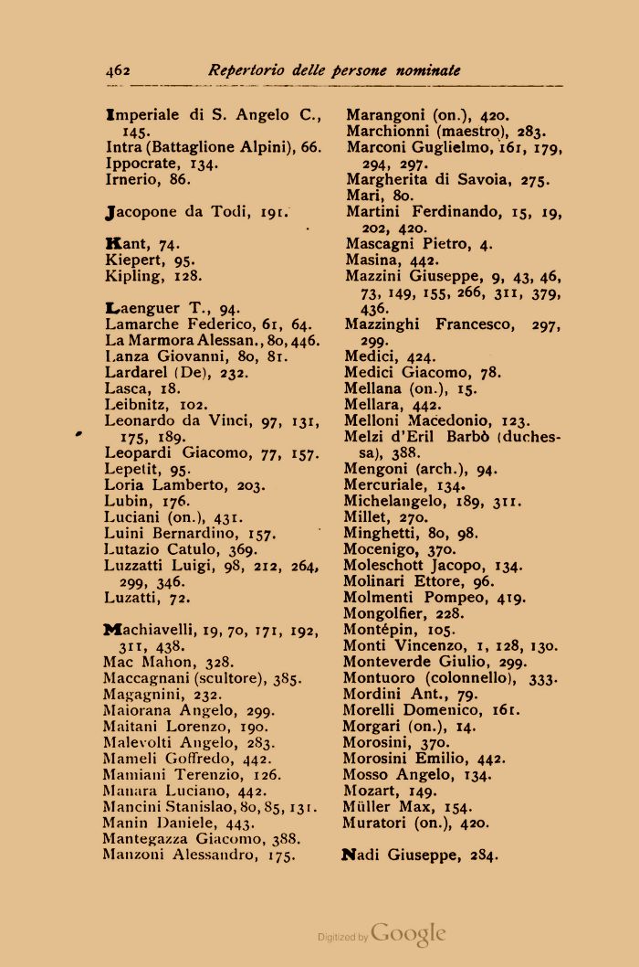 299. Medici, 424. Medici Giacomo, 78. Mellana (on.), 15. Mellara, 442. Melloni Macedonio, 123. Melzi d'Eril Barbò (duchessa), 388. Mengoni (arch.), 94. Mercuriale, 134. Michelangelo, 189, 311. Millet, 270. Minghetti, 80, 98. Mocenigo, 370. Moleschott Jacopo, 134. Molinari Ettore, 96. Molmenti Pompeo, 419. Mongolfier, 228. Montépin, 105. Monti Vincenzo, 1, 128, 130. Monteverde Giulio, 299. Montuoro (colonnello), 333. Mordini Ant., 79. Morelli Domenico, i6t. Morgari (on.), 14. Morosini, 370. Morosini Emilio, 442. Mosso Angelo, 134. Mozart, 149. Mailer Max, 154. Muratori (on.), 420.