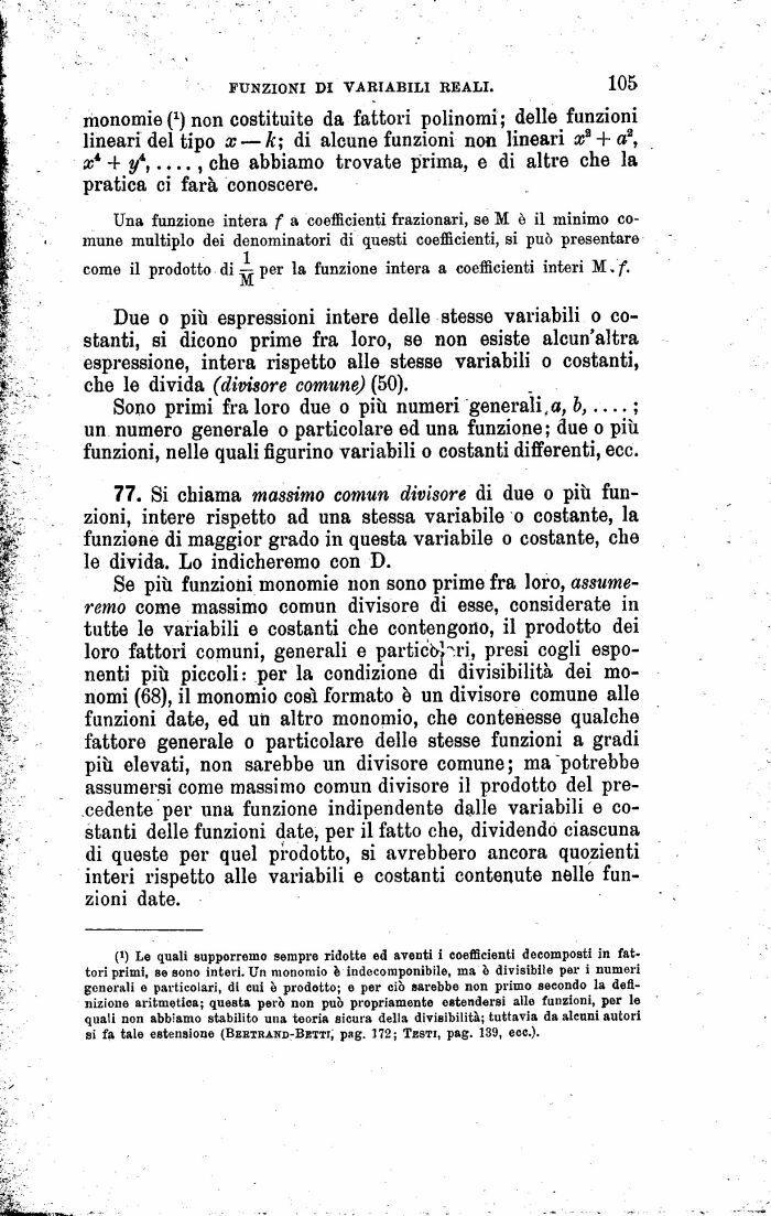 (l) Le quali supporremo sempre ridotte ed aventi i coefficienti decomposti in fattori primi, se sono interi. Un monomio è indecomponibile, ma è divisibile per i numeri generali e particolari, di cui è prodotto; e per ciò sarebbe non primo secondo la definizione aritmetica; questa però non può propriamente estendersi alle funzioni, per le quali non abbiamo stabilito una teoria sicura della divisibilità; tuttavia da alcuni autori si fa tale estensione (Bebtrakd-Betti; pag. 172; Testi, pag. 139, ecc.).