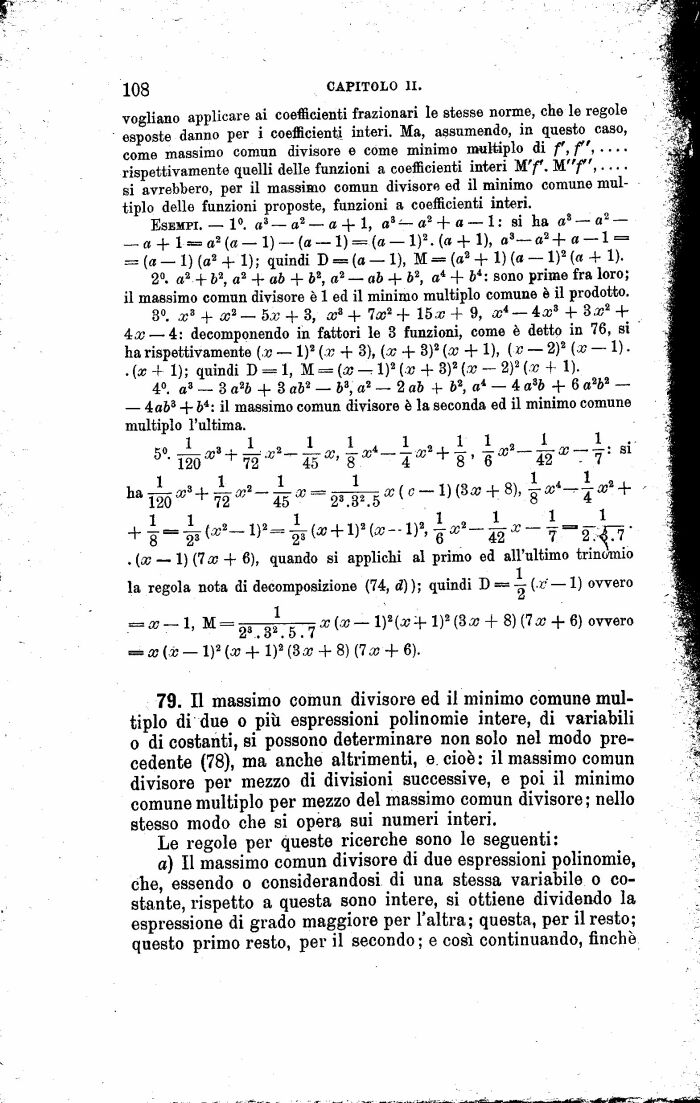 79. Il massimo comun divisore ed il minimo comune multiplo di due o più espressioni polinomie intere, di variabili o di costanti, si possono determinare non solo nel modo precedente (78), ma anche altrimenti, e cioè: il massimo comun divisore per mezzo di divisioni successive, e poi il minimo comune multiplo per mezzo del massimo comun divisore; nello stesso modo che si opera sui numeri interi.
