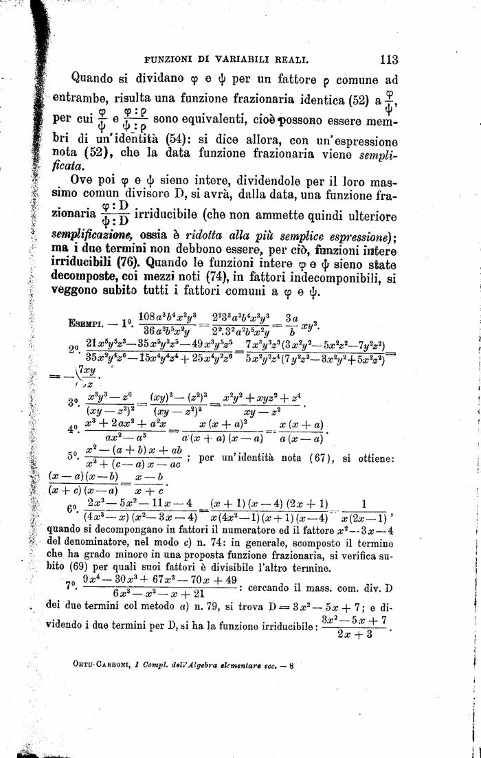 semplificazione, ossia è ridotta alla più semplice espressione); ma i due termini non debbono essere, per ciò, funzioni intere irriducibili (76). Quando le funzioni intere cp e tfr sieno state decomposte, coi mezzi noti (74), in fattori indecomponibili, si veggono subito tutti i fattori comuni a