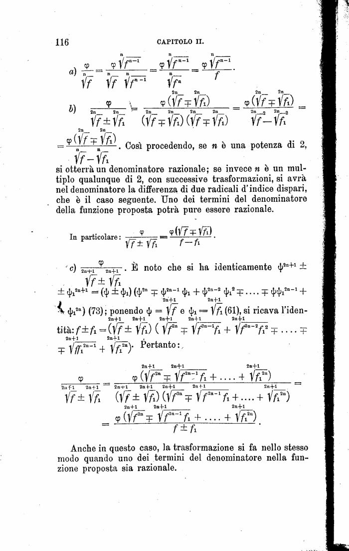 si otterrà un denominatore razionale; se invece« è un multiplo qualunque di 2, con successive trasformazioni, si avrà nel denominatore la differenza di due radicali d'indice dispari, che è il caso seguente. Uno dei termini del denominatore della funzione proposta potrà pure essere razionale.