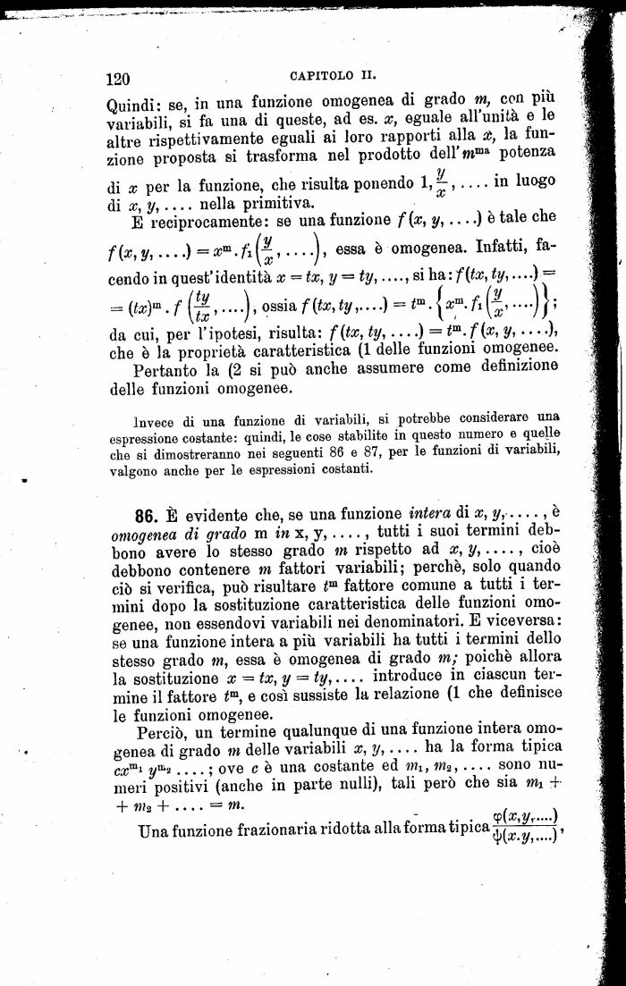 86. E evidente che, se una funzione intera di x, y,...., è omogenea di grado m inx, j, ...., tutti i suoi termini debbono avere lo stesso grado m rispetto ad x, y,...., cioè debbono contenere m fattori variabili; perchè, solo quando ciò si verifica, può risultare tm fattore comune a tutti i termini dopo la sostituzione caratteristica delle funzioni omogenee, non essendovi variabili nei denominatori. E viceversa: se una funzione intera a più variabili ha tutti i termini dello stesso grado m, essa è omogenea di grado m; poiché allora la sostituzione x tx, y = ty,.... introduce in ciascun termine il fattore tm, e così sussiste la relazione (1 che definisce le funzioni omogenee.