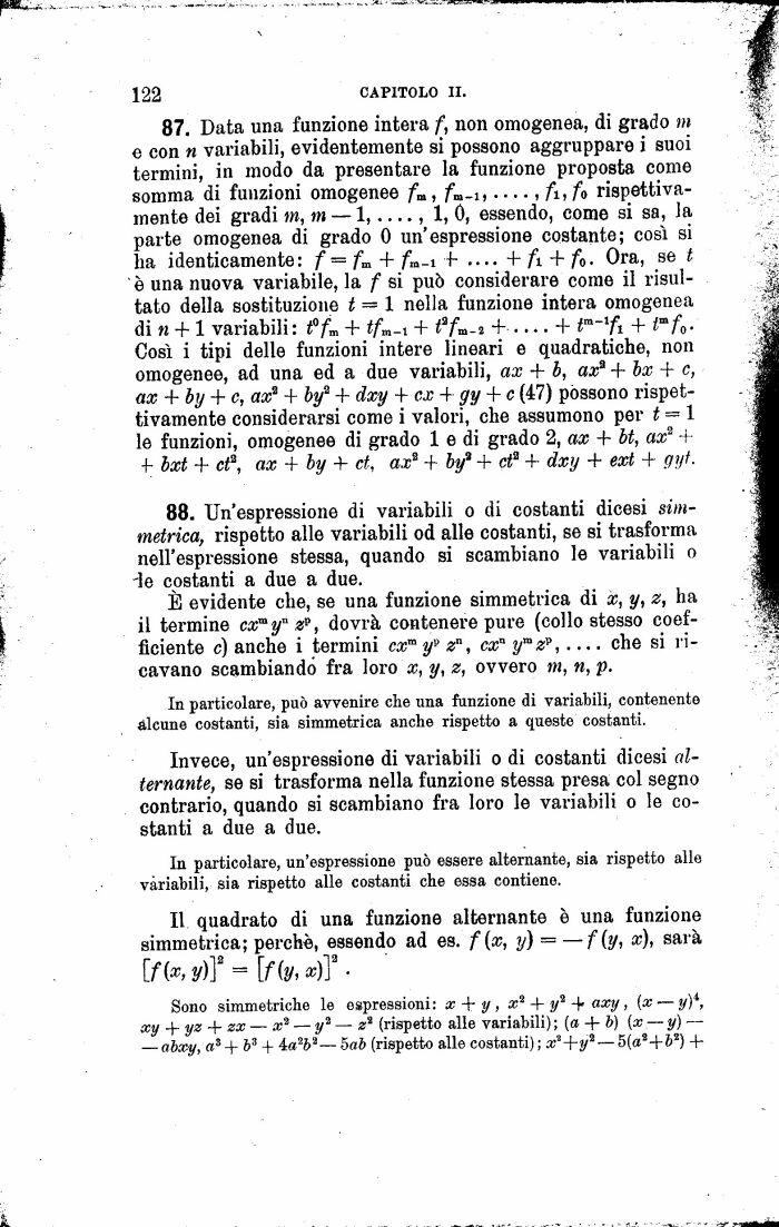 88. Un'espressione di variabili o di costanti dicesi simmetrica, rispetto alle variabili od alle costanti, se si trasforma nell'espressione stessa, quando si scambiano le variabili o -le costanti a due a due.