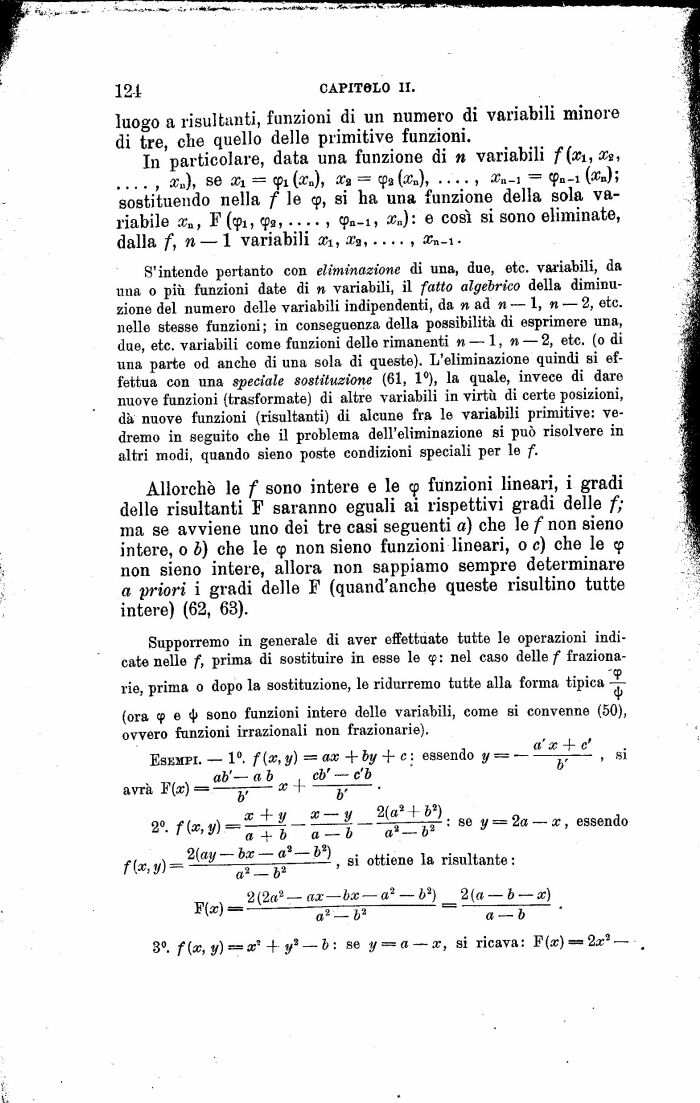 S'intende pertanto con eliminazione di una, due, etc. variabili, da una 0 più funzioni date di n variabili, il fatto algebrico della diminuzione del numero delle variabili indipendenti, da » ad m 1, n 2, etc. nelle stesse funzioni ; in conseguenza della possibilità di esprimere una, due, etc. variabili come funzioni delle rimanenti n 1, n 2, etc. (0 di una parte od ancbe di una sola di queste). L'eliminazione quindi si effettua con una speciale sostituzione (61, 1°), la quale, invece di dare nuove funzioni (trasformate) di altre variabili in virtù di certe posizioni, dà nuove funzioni (risultanti) di alcune fra le variabili primitive: vedremo in seguito che il problema dell'eliminazione si può risolvere in altri modi, quando sieno poste condizioni speciali per le f.