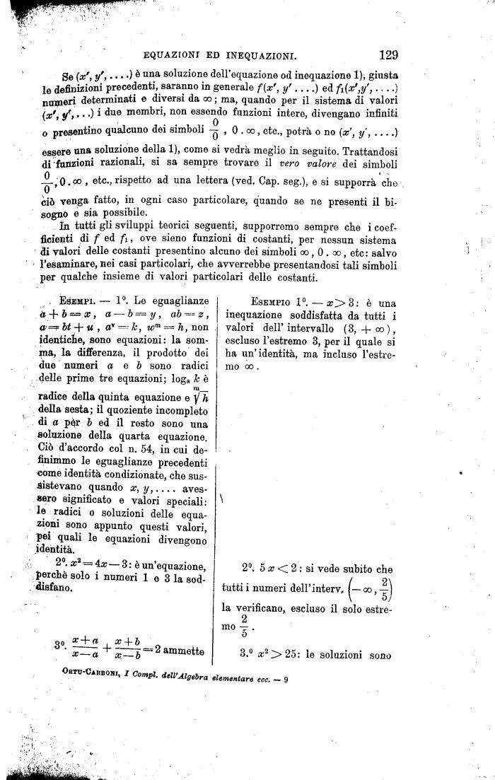 radice della quinta equazione e h della sesta; il quoziente incompleto di a per b ed il resto sono una soluzione della quarta equazione. Ciò d'accordo col n. 54, in cui definimmo le eguaglianze precedenti come identità condizionate, che sussistevano quando x, y,.... avessero significato e valori speciali: le radici o soluzioni delle equazioni sono appunto questi valori, pei quali le equazioni divengono identità.